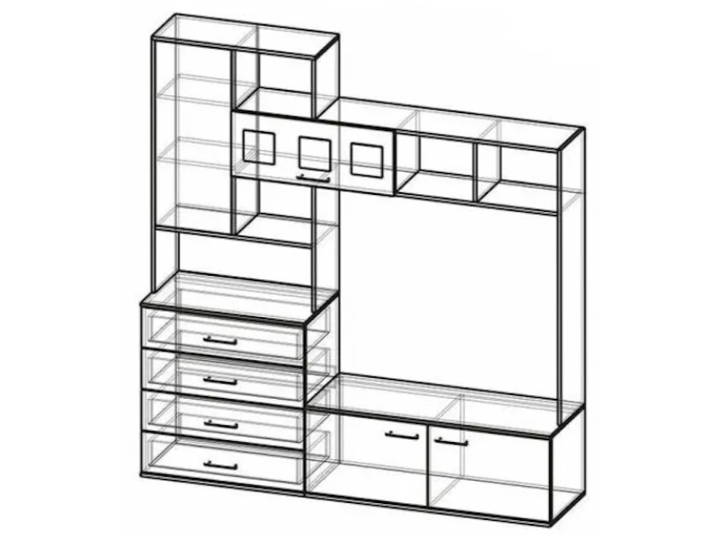 Центральная секция имеет четыре выдвижных ящика с использованием механизма полного выдвижения и закрывания, дно ящика выполнено в цвете корпуса.