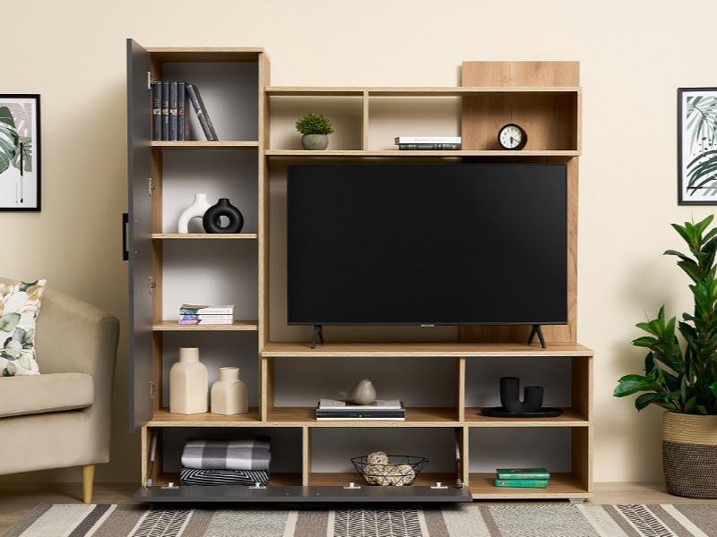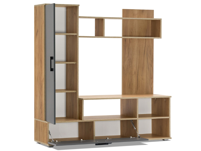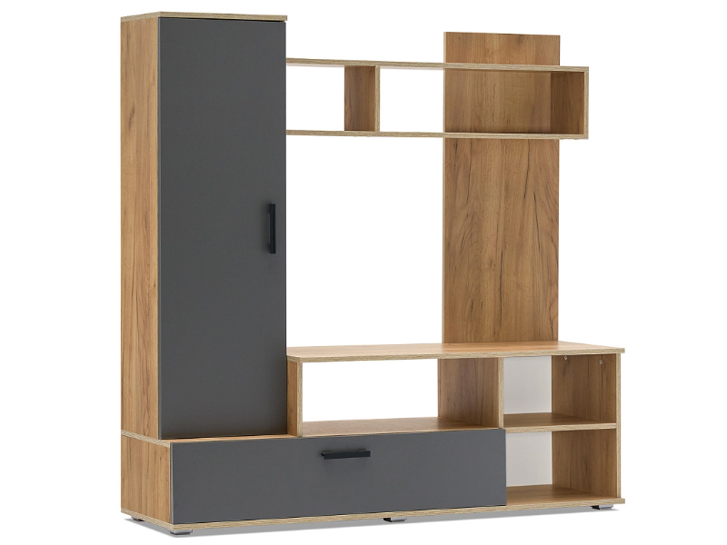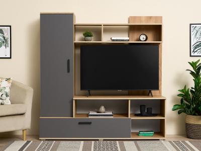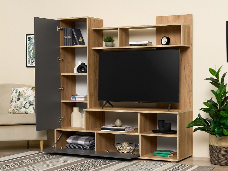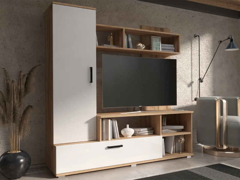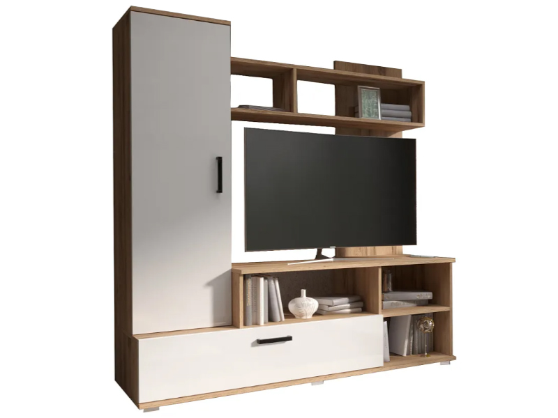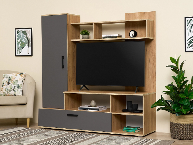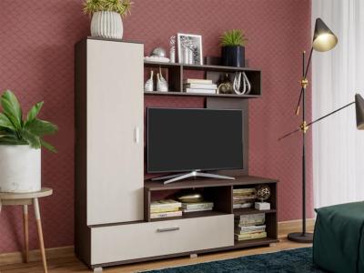 Миниатюрная стенка в неповторимом стиле, с местом под большой телевизор. Она вместит в себя все самое необходимое. Современное удобное решение для маленькой гостиной или спальной комнаты.