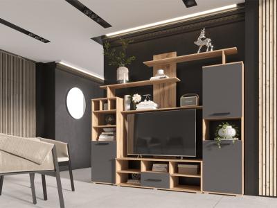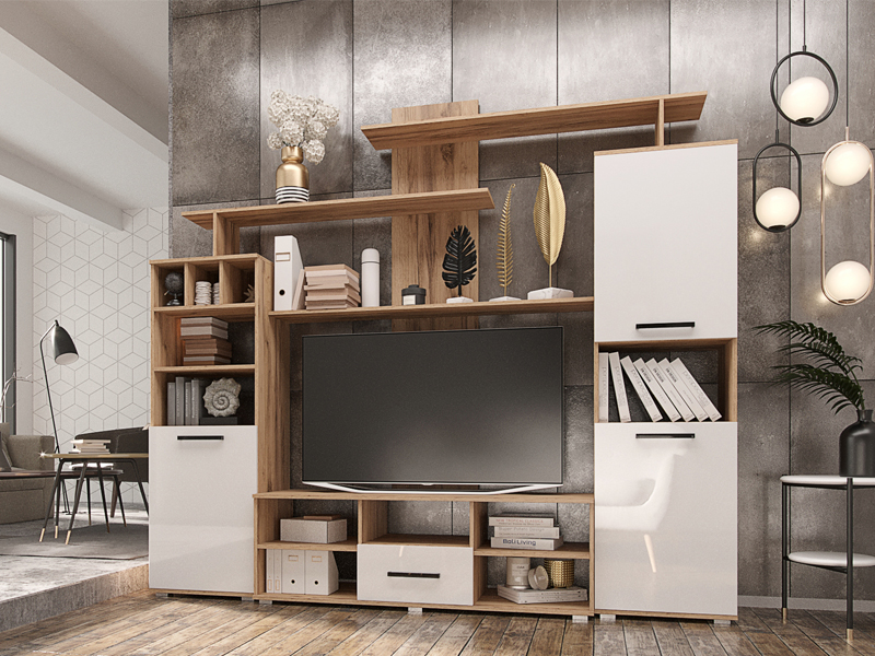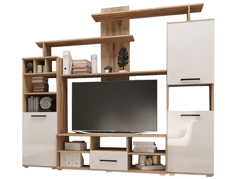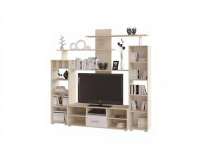 Светлая современная глянцевая гостиная с приятным дизайном. Мебельная горка для гостиной будет отлично смотреться на фоне более насыщенного по цвету интерьера, смягчая и осветляя его.