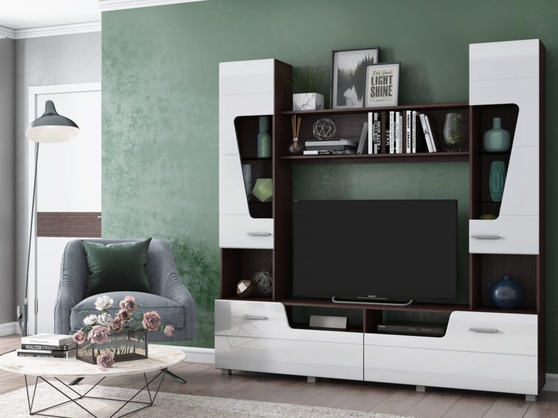 Габаритные размеры всего изделия – Д2000 x В2028 x Г381мм. МОНИКА БМ-102 (Базовый модуль) состоит из 4-х секций: Тумба напольная под ТВ – общим габаритом Д2000 х В491 х Г381мм., имеет две откидные створки на газлифтах(секретерных) и два открытых проема под технику размером 593 х 154мм. Два пенала – общим габаритом Д390 х В1537 х Г317мм., надставленные на тумбу имеют открытую нишу высотой 329мм. и отделение с двумя стеклополками и одной полкой из ЛДСП (сверху), закрытое створками с криволинейными вырезами, которые в свою очередь, закрыты прозрачным стеклом. Полка, состоящая из 2-х горизонтальных деталей, расстояние между которыми 272мм., прикреплённых к задней стенке и между внутренними боковинами пеналов, что не даёт шанса для их прогиба, имеет общий габарит - Д1222 х В362 х Г218мм. Место под ТВ имеет размер Д1222 х В876мм., что предоставляет возможность иметь телевизор большого размера подвесив его на стену, либо установив его на напольную тумбу, имеющую ребро жёсткости, что обеспечивает защиту от её прогиба под весом телевизора. А в открытых нишах, к примеру, возможно разместить DVD-плеер либо небольшую мультимедийную приставку. Крепление МОНИКА БМ-102 (Базовый модуль) к стене, производиться при помощи нерегулируемых навесов с накладкой в количестве двух штук, согласно схемы сборки. МОНИКА БМ-102 (Базовый модуль) имеет возможность использоваться: как с МОНИКА ШК-104 (Шкаф с выдвижной штангой), так и с МОНИКА ШК-105 (Шкаф со штангой).