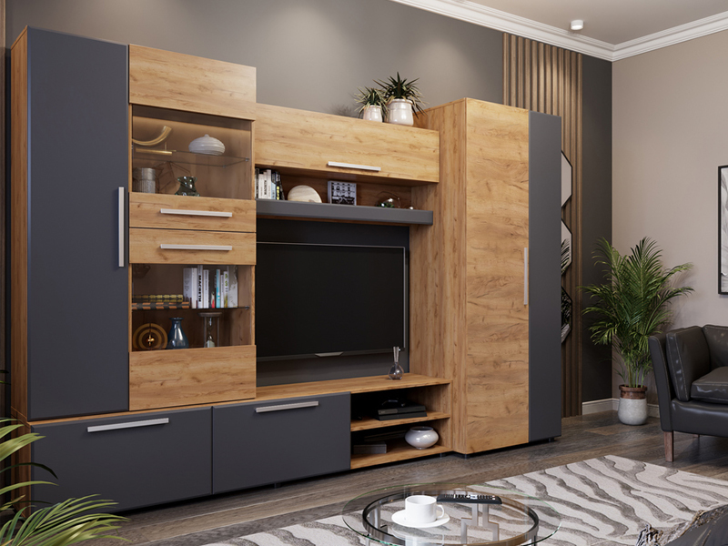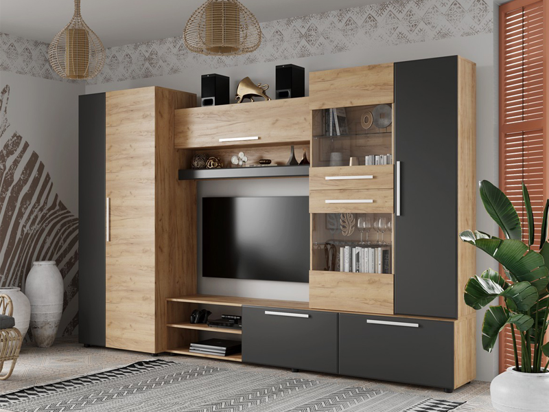 «САФАРИ НМ Стенка» выполнена в современном выдержанном европейском стиле. Стенка предназначена для оборудования гостиных жилых домов и квартир. Отличительными особенностями модели являются наличие вместительных модулей (шкафа, надстройки, антресоли, тумбы под ТV) и элегантный дизайн, сочетающий изысканность цвета и фактур корпуса и фасадов яркого «Дуб Крафт золотой» и мягкого «Графит СОФТ».