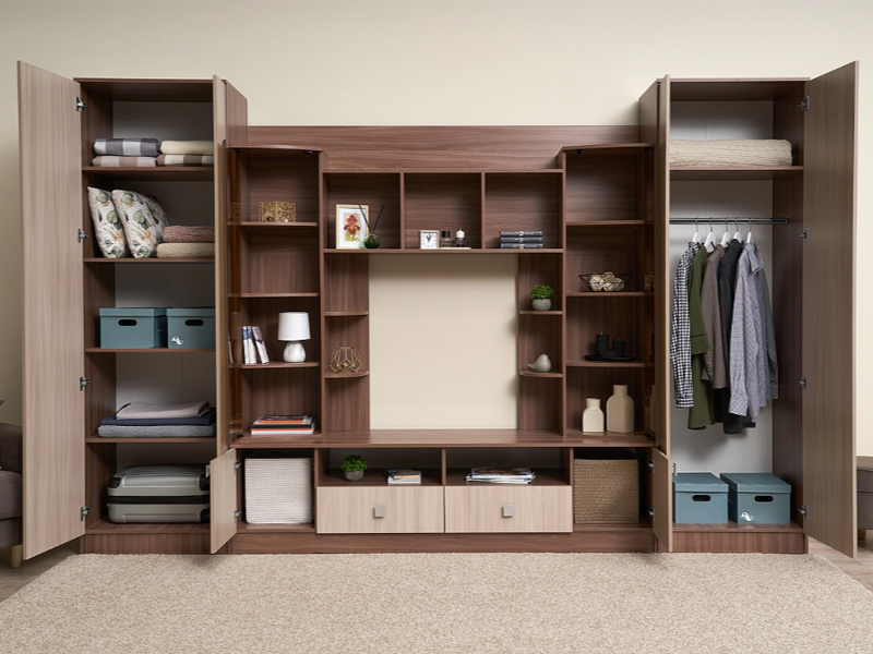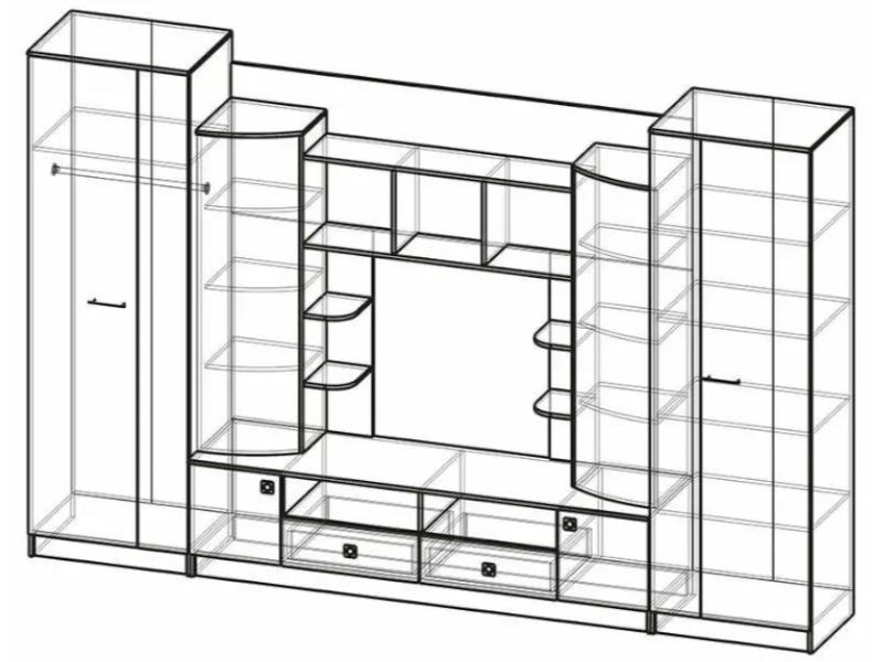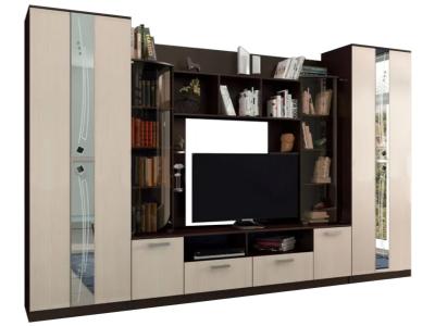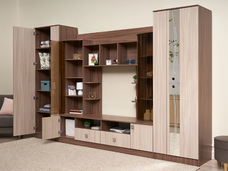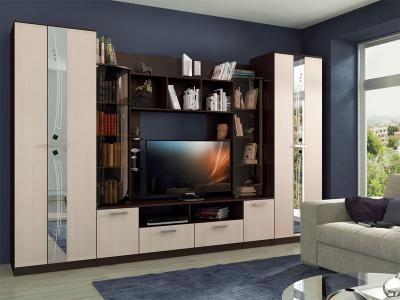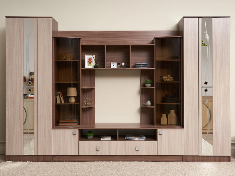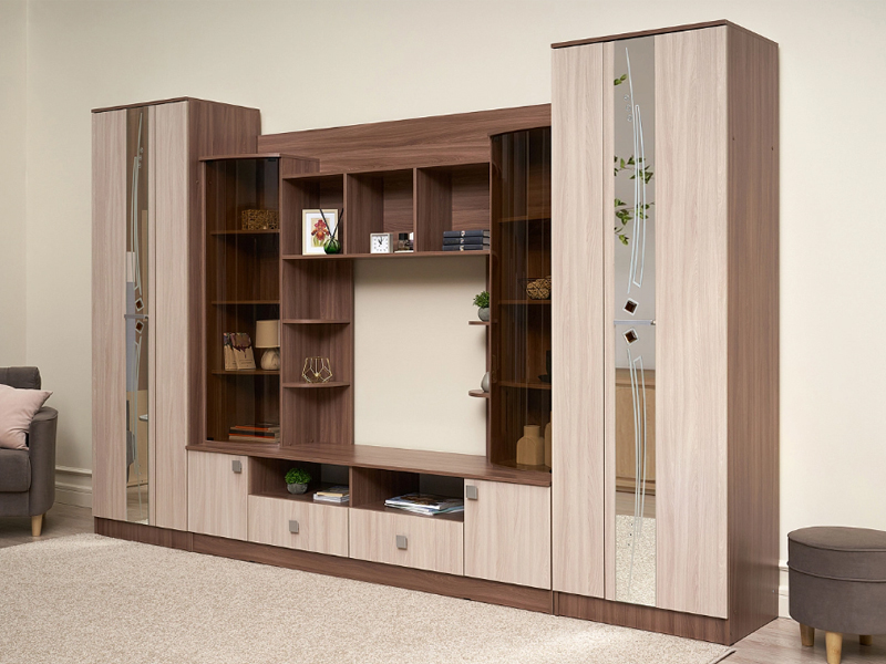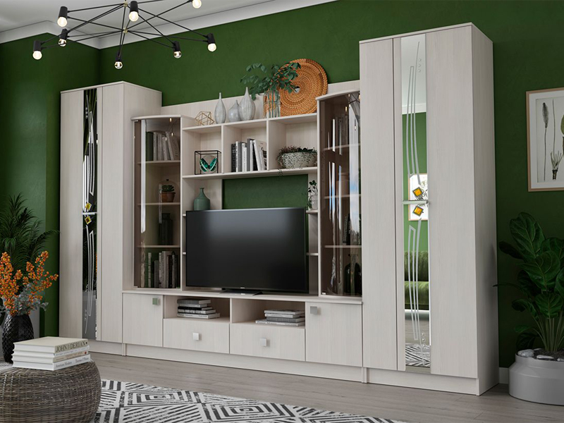 Шикарная современная модульная система с продуманным до тонкостей дизайном – для формирования уникального интерьера гостиной зоны. В оформлении использован пескоструйный рисунок на зеркалах и дверцы с тонированными стеклами.
