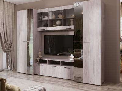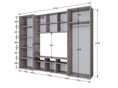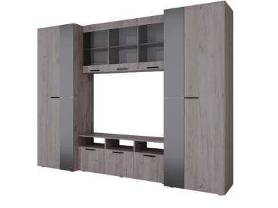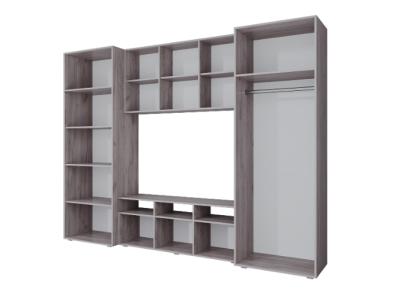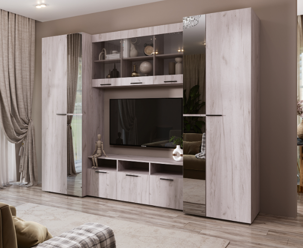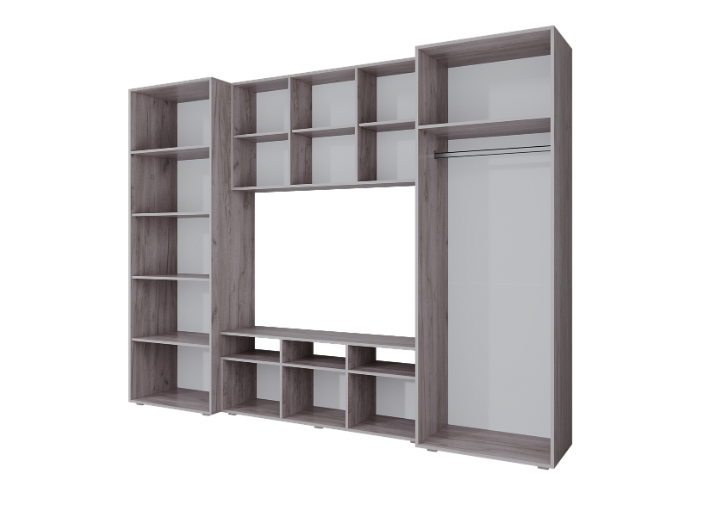 - Включает в себя: платяной и бельевой шкафы, тумбу под ТВ, открытые полки и полку-витрину со стеклянными створками.