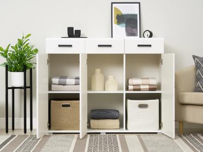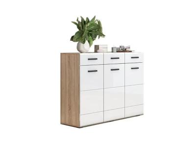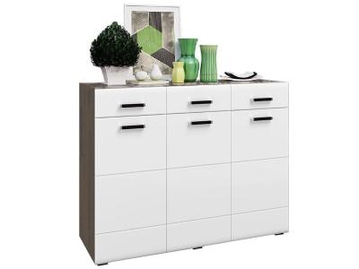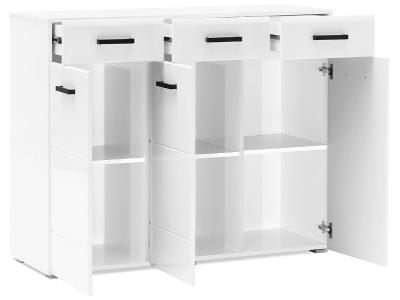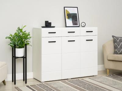 Комод Нэнси New с необычном дизайном, с белыми глянцевыми фасадами,создаст необходимый уровень комфорта. Глянцевые фасады оживят комнату, внесут в нее свежесть, торжественность и чистоту. Каркас комода выполнен из ЛДСП белый, фасады МДФ белый глянец. Направляющие ящиков роликовые