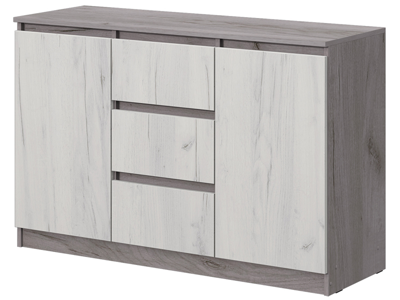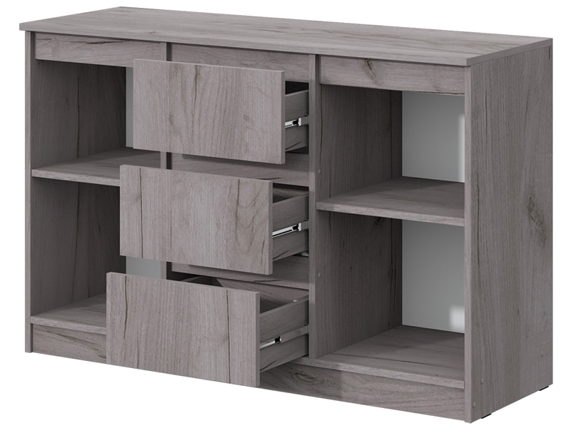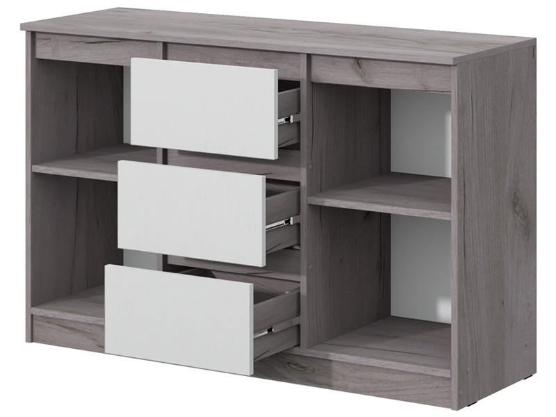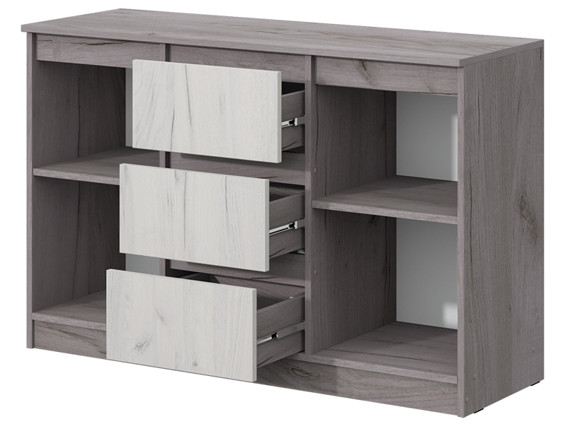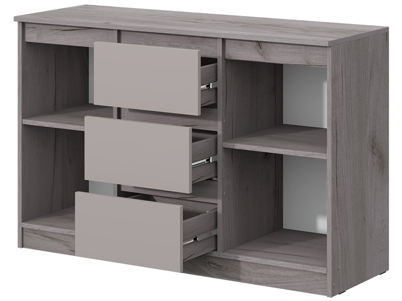 - Комбинированный комод: по центру 3 ящика и по бокам 2 распашные створки с полкой внутри отделения.