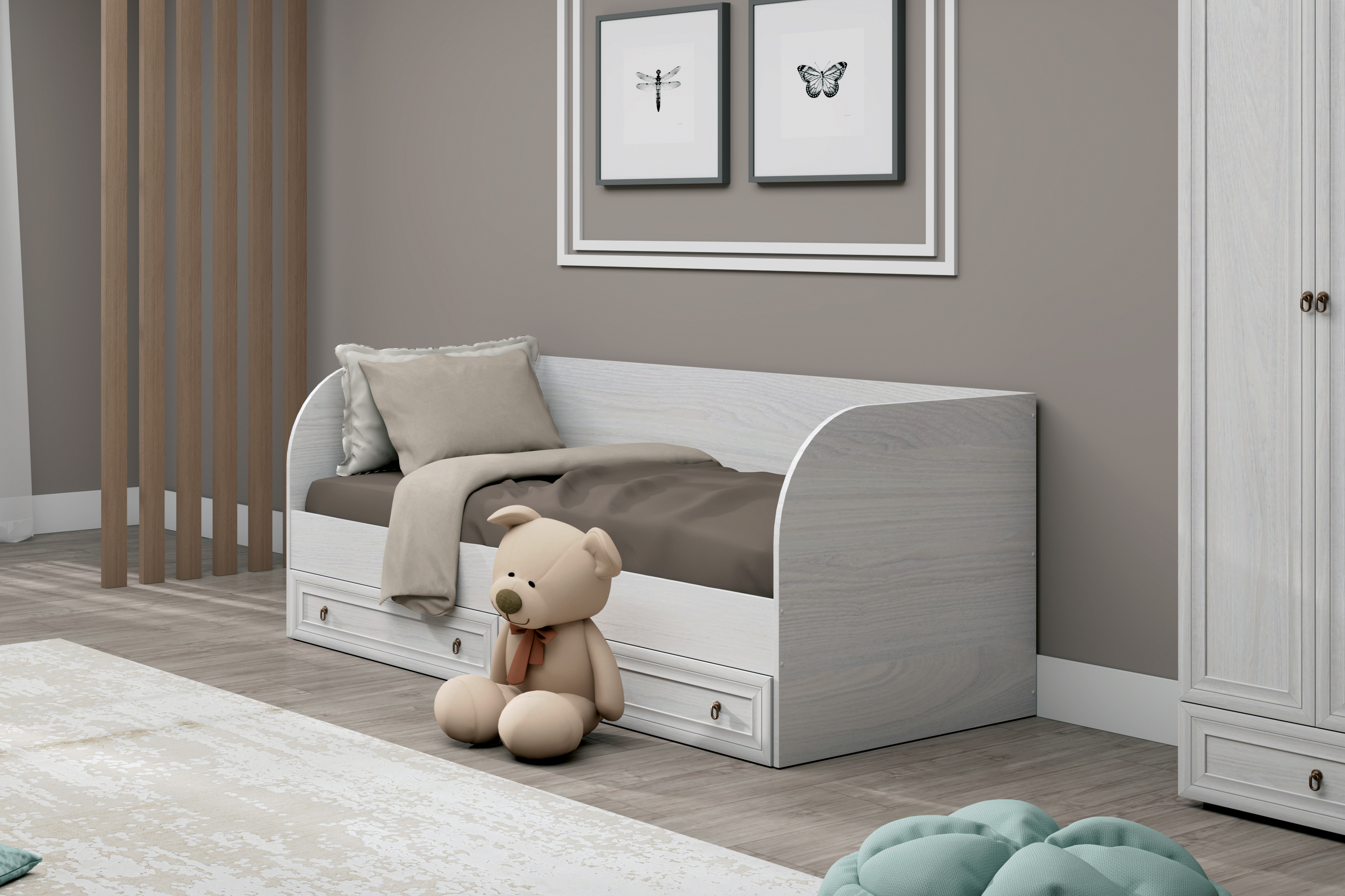 - Кровать с большими выдвижными ящиками с возможностью использования в целях хранения вещей, игрушек или белья.