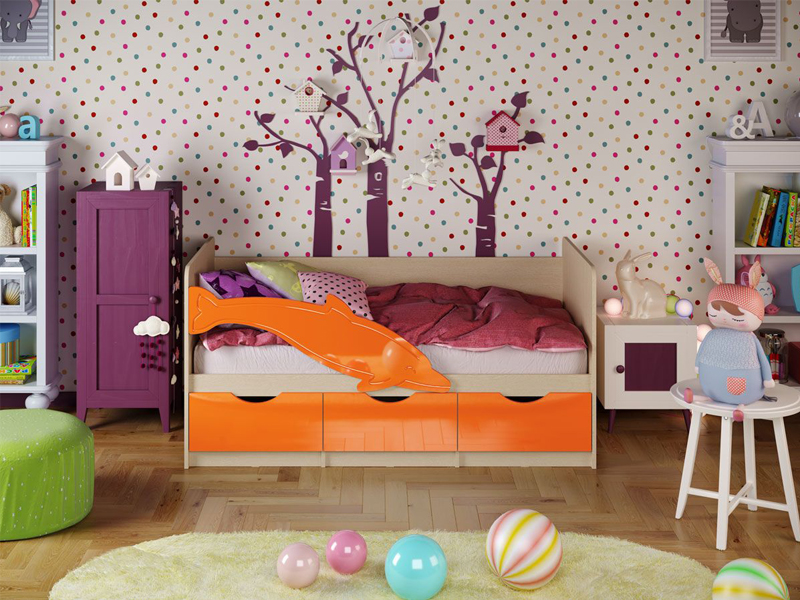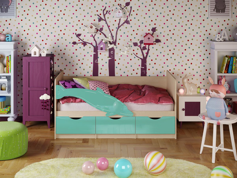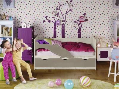 Удобная, прочная и устойчивая кровать с выдвижными ящиками. Передний ограничительный бортик выполнен в виде дельфина. Для маленьких детей и подростков.
