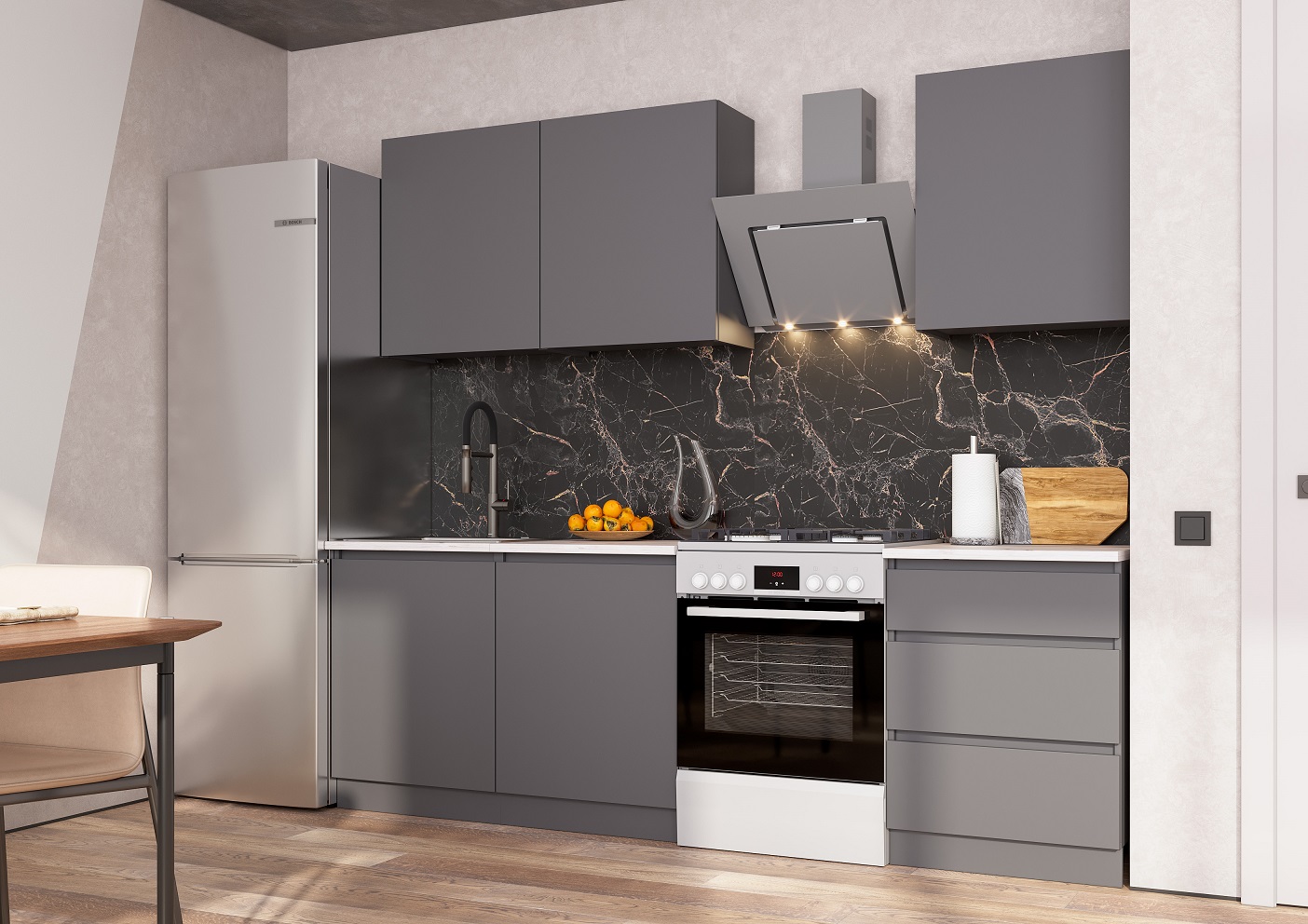 Кухонный гарнитур Айден - практичный комплект из ЛДСП длиной 1,8 метра в современном стиле. - Верхние модули: ШВ 600-1, ШВ 600-1, ШВ 600-1 (ВхГ) 715х300 мм - Нижние модули: ШНМ 600-1, ШН 600-1, ШН3Я 600 (ВхГ) 841х470 мм, высота указана с учётом столешницы Столешница 26 мм: Сосна бискайская - Шариковые направляющие - Лицевая фурнитура отсутствует Высота кухонного гарнитура изменяется в зависимости от вашего варианта установки
