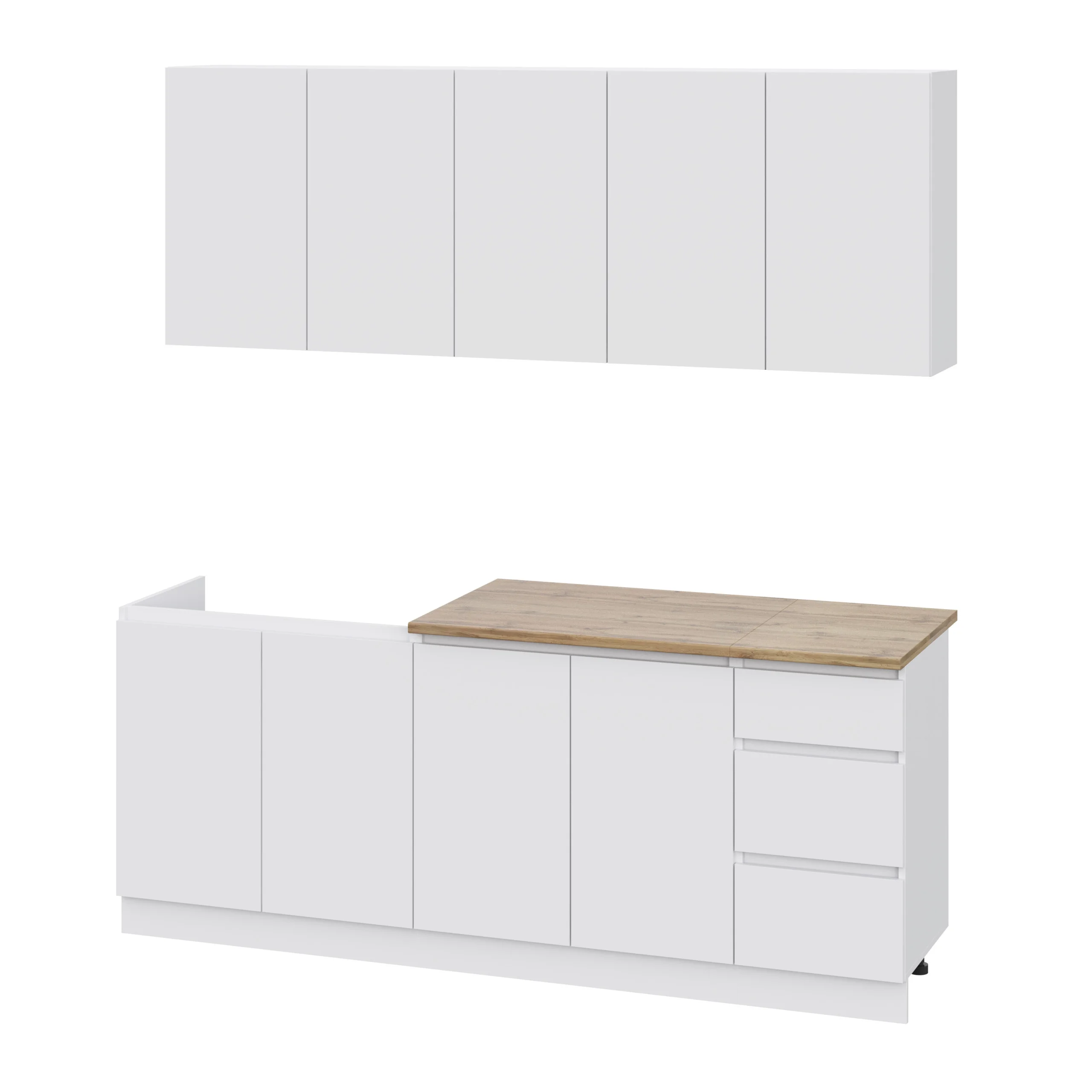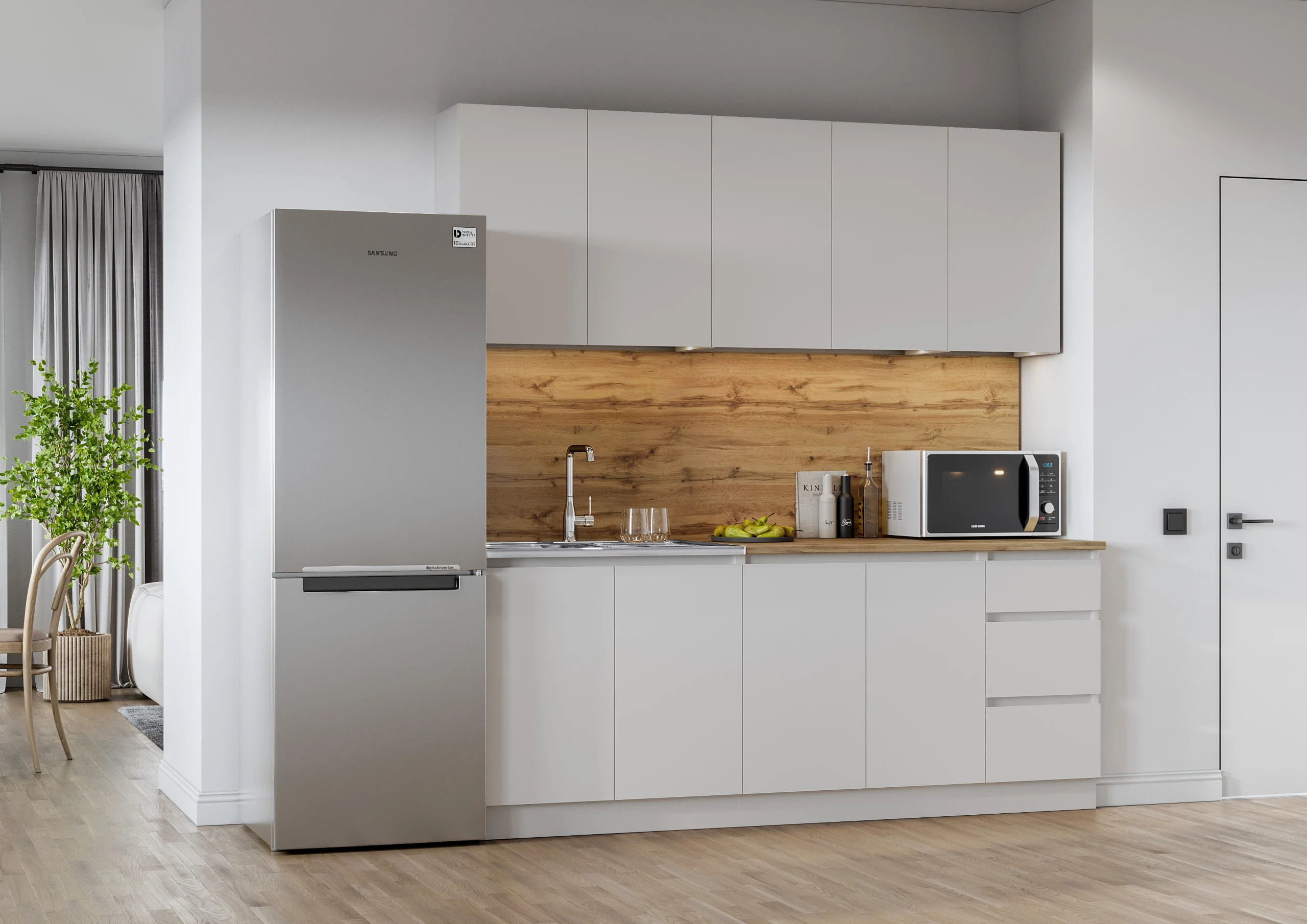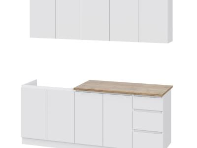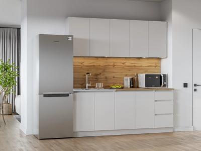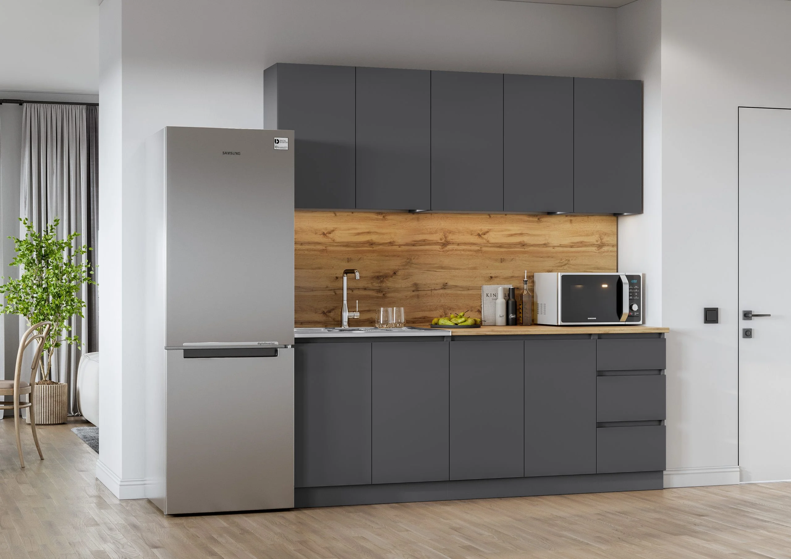 Прямой кухонный гарнитур с фасадамит без ручек выполнен из прочного ЛДСП в современном стиле.