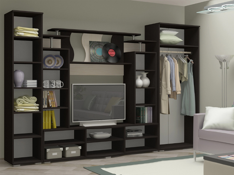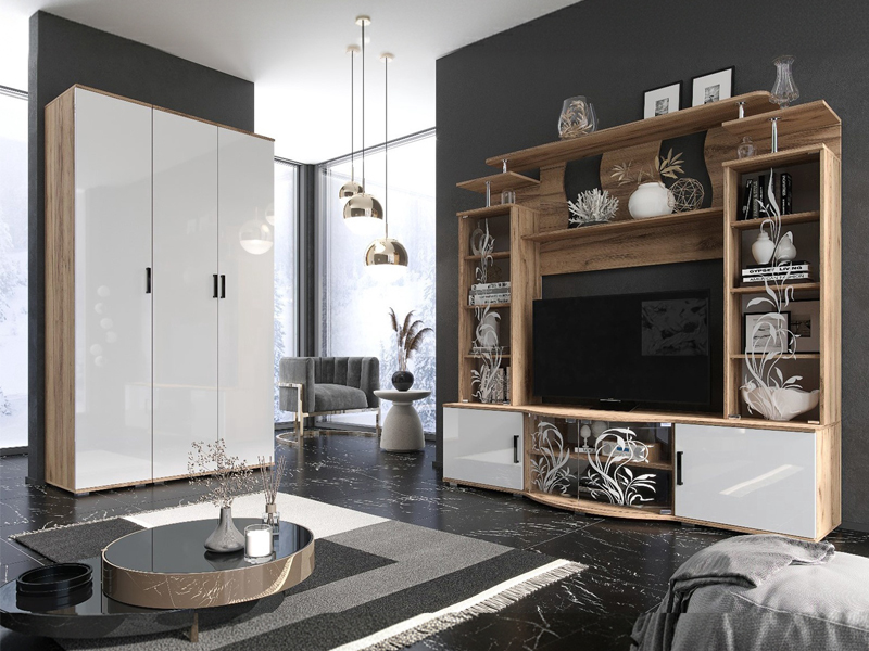 Стенка Виста - компактная мебель для гостиной комнаты. Мебель изготовлена из влагостойкого ЛДСП. В данной стенке есть все. что необходимо в современной гостиной - тумба под ТВ, витрина, полки, двухдверный шкаф и пенал для различных вещей. На стеклах витрин - изящный рисунок. Стенку можно приобрести без шкафа и пенала, так же с одним из этих предметов. Шкаф и пенал так же можно приобрести по отдельности.