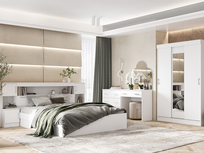 В самом названии этой спальни видится что-то мягкое, удобное и уютное. Интересное и функциональное дизайнерское решение – кровать с надстройкой – служит дополнительным местом для хранения вещей.