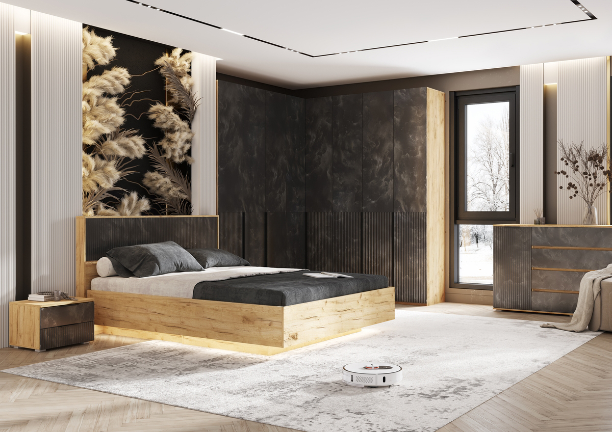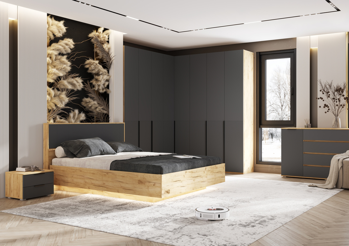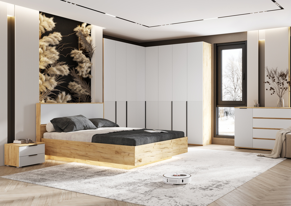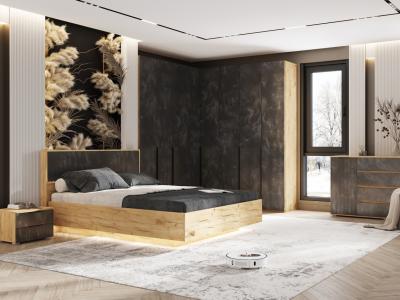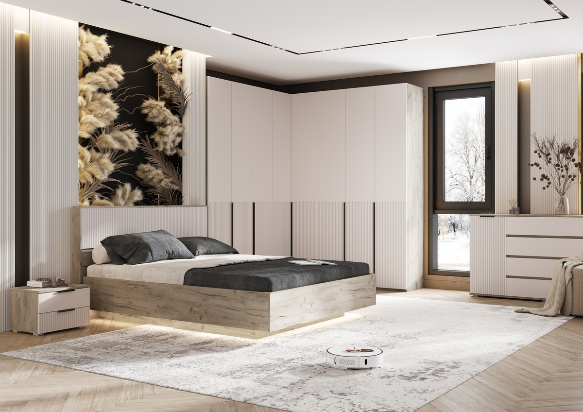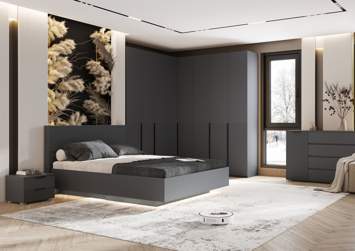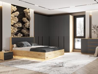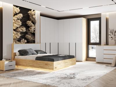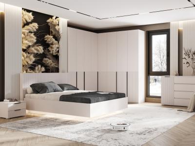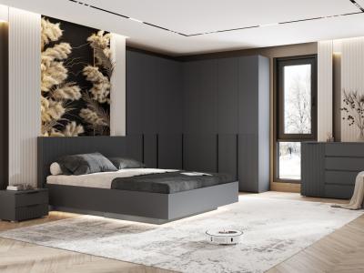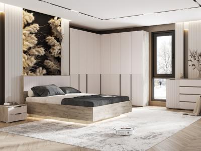 Кровать парящая 1.6м + Тумба прикроватная + Шкаф угловой + Шкаф 3-х ств.(1200)(2шт) + Комод 2 двери 4 ящика (1600)