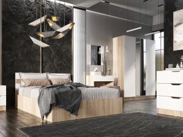 Материал корпуса - ЛДСП Материал фасада - МДФ (софт, шарли) Кровать от 0.8 до 1.6м Шкаф - 1.5х2.2х0.6м Зеркало - 0.8х0.6м Комод - 0.6х1.17х0.44м