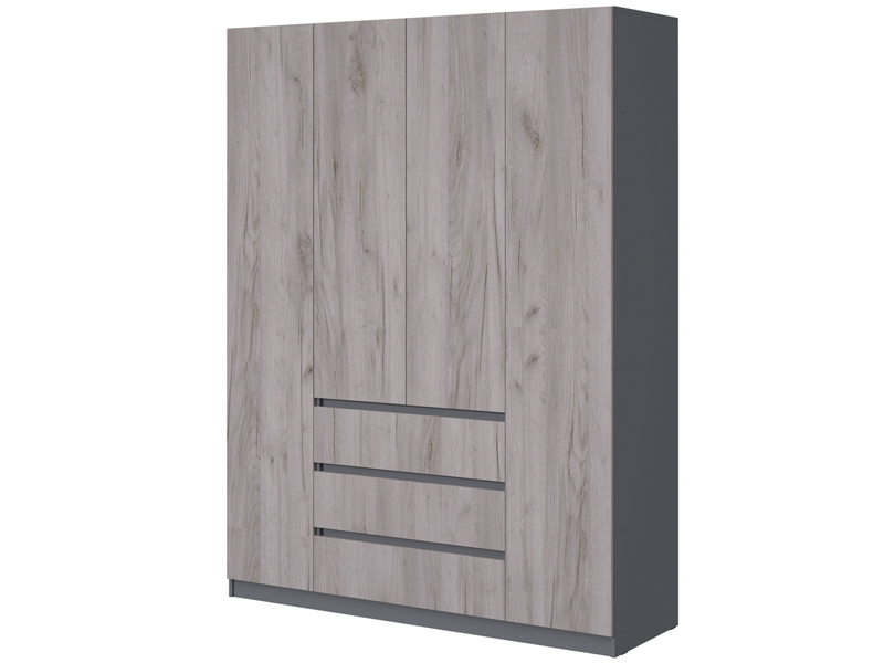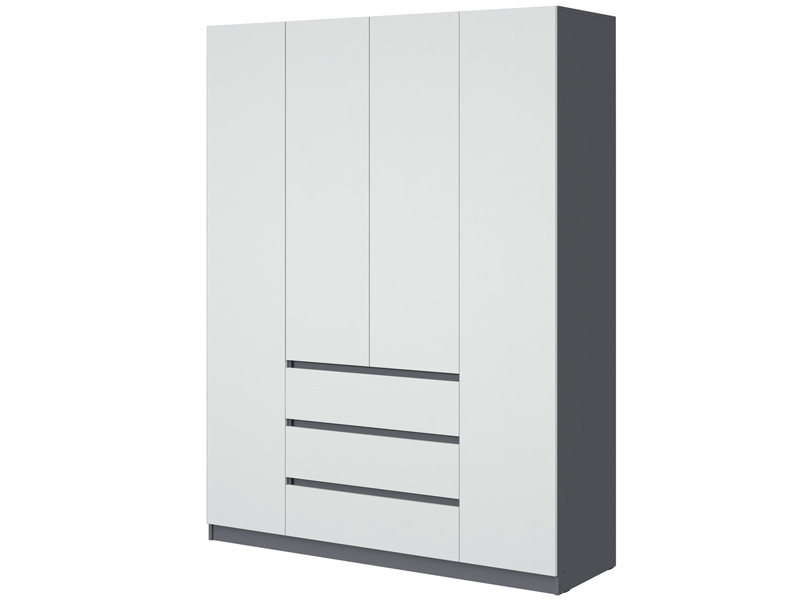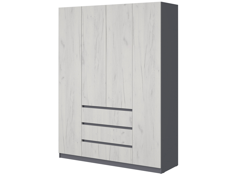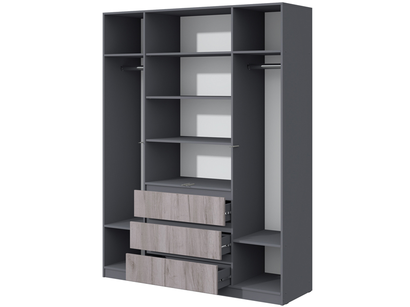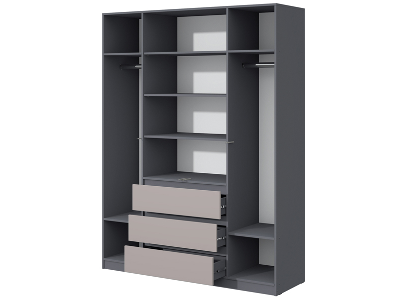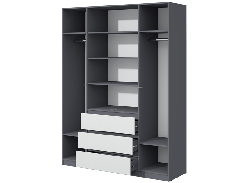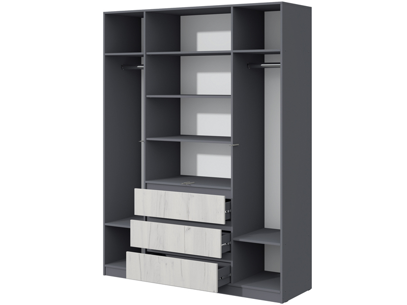 - Шкаф комбинированный: 2 отделения со штангой (379 мм) для одежды на плечиках, отдел с полками и 3 выдвижных ящика.