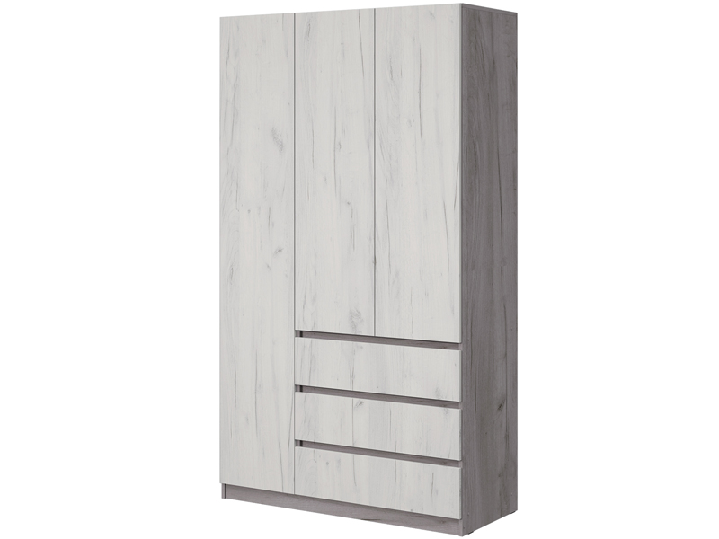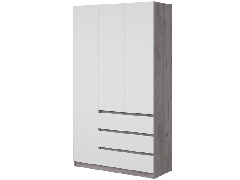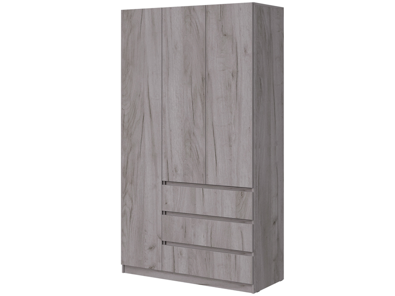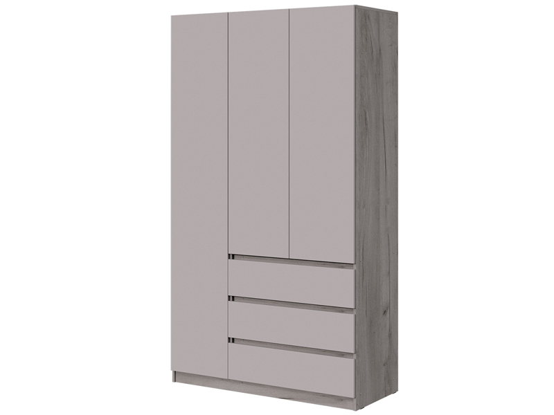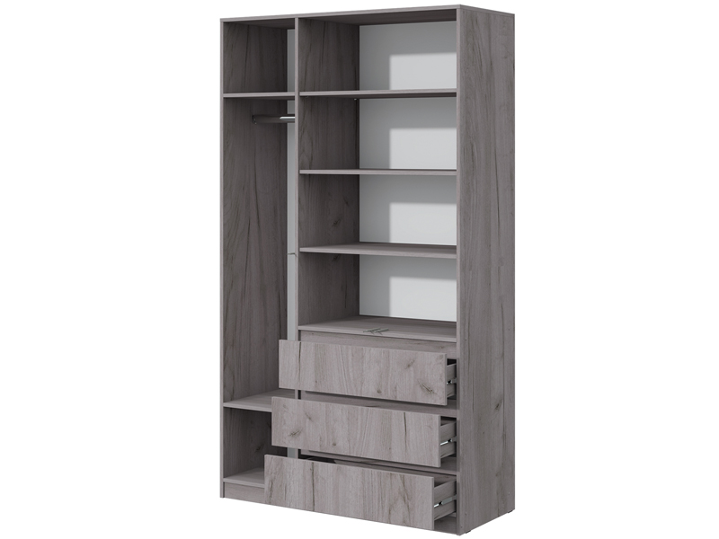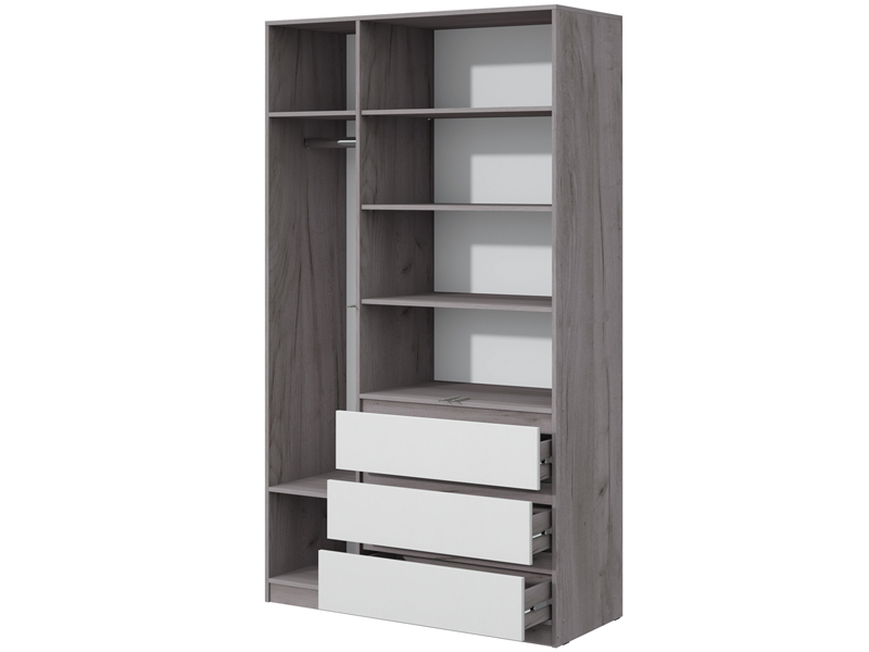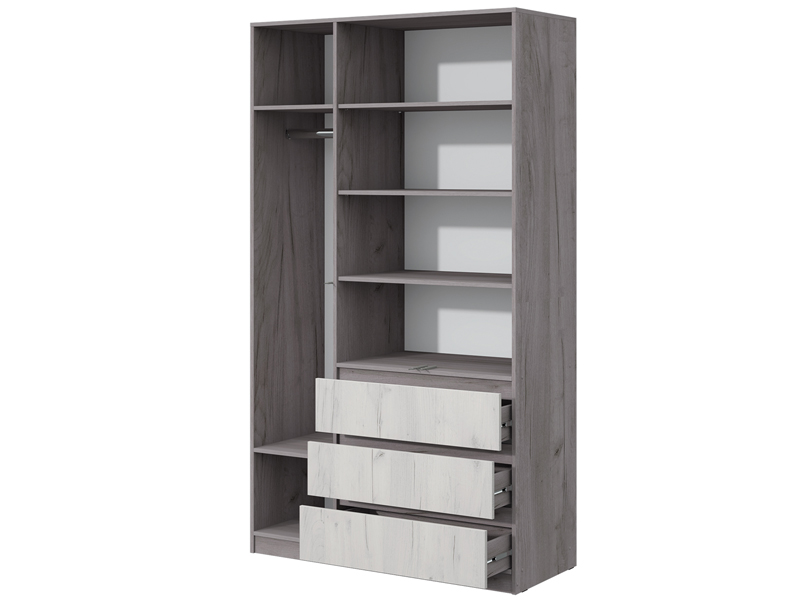 - Шкаф комбинированный: 1 отделение со штангой (379 мм) для одежды на плечиках, отдел с полками и 3 выдвижных ящика.