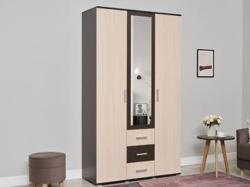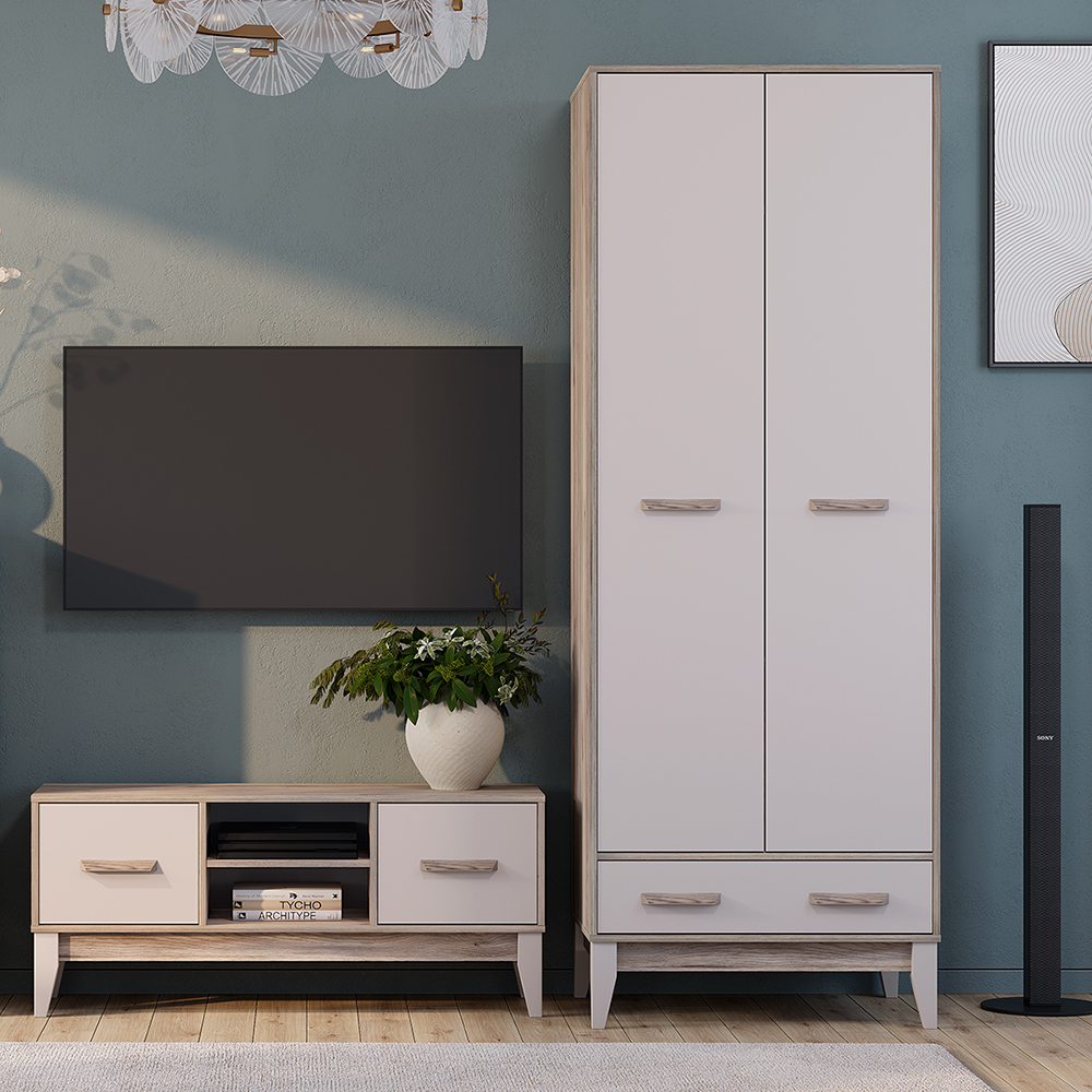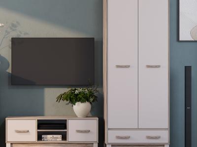 Двухстворчатый шкаф «Скандика» выполнен из качественной ЛДСП в оттенках дуб смоки/кашемир. Матовые фасады практичны в использовании. Модель состоит из нижнего выкатного ящика, двух распашных дверок, за которыми находится отделения с хромированной штангой, вместительная верхняя полка и встроенный блок с двумя дополнительными полками.
