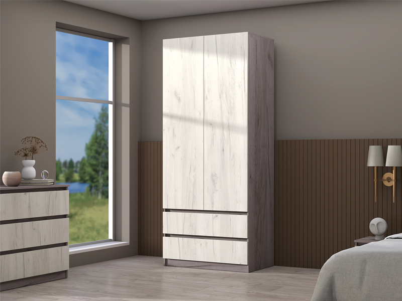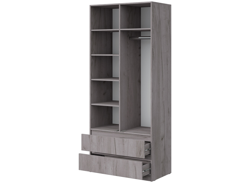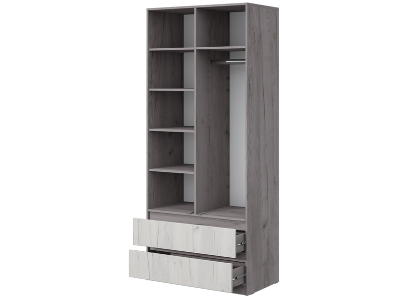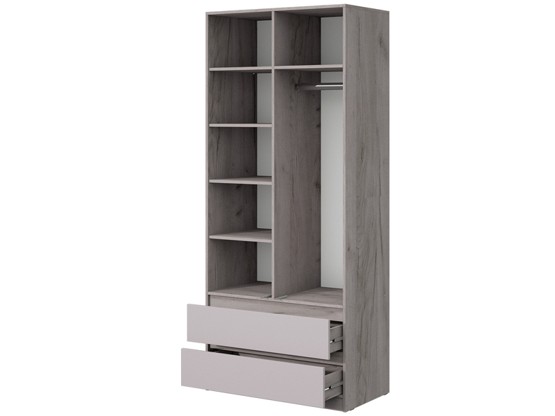 - Шкаф комбинированный: отделение со штангой (421 мм) для одежды на плечиках, отдел с полками и 2 выдвижных ящика.