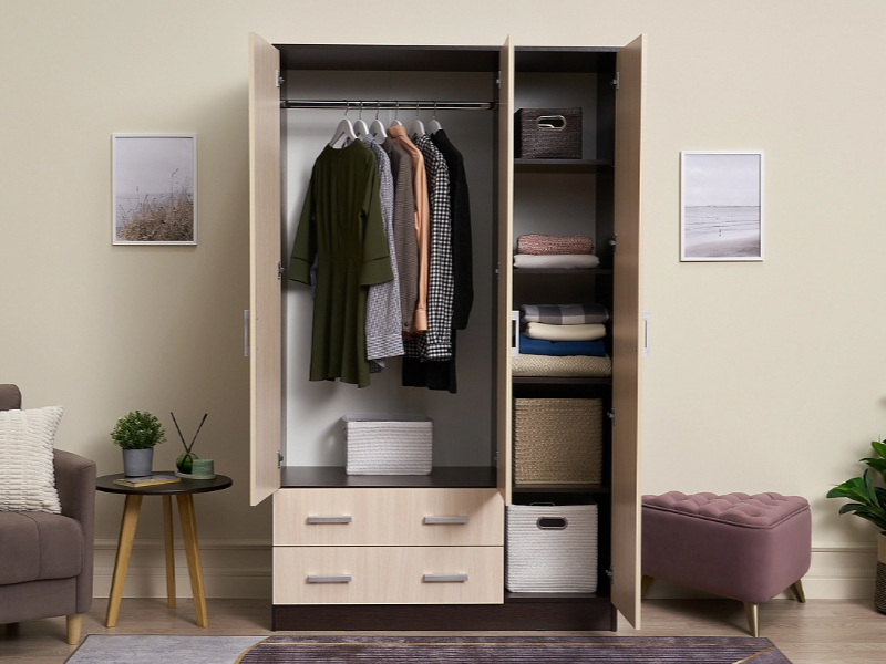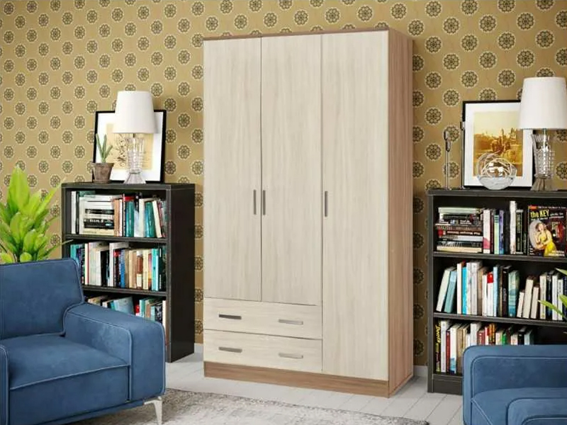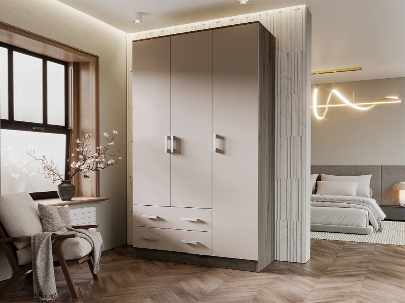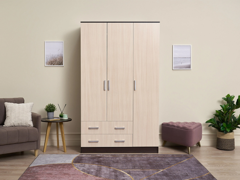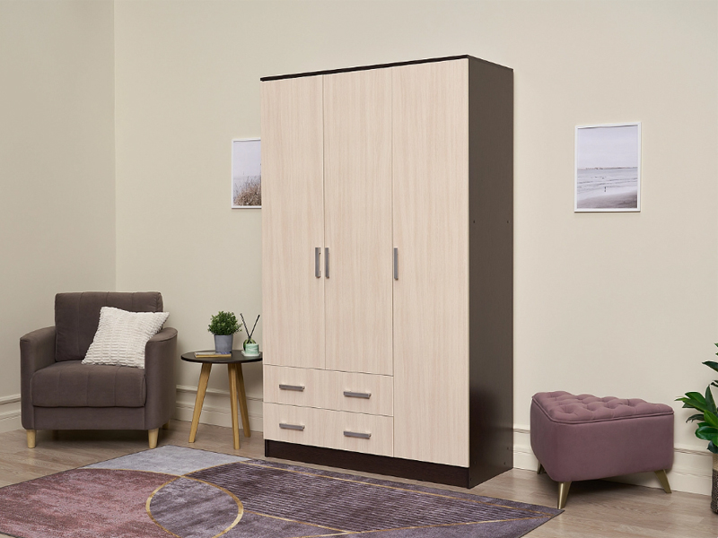 Трехстворчатый шкаф без вычурного декора идеально впишется в любой интерьер. Он одинаково хорошо подойдет для прихожей, небольшой спальни или детской. Лаконичная форма изделия компенсируется за счет использования контрастных материалов.