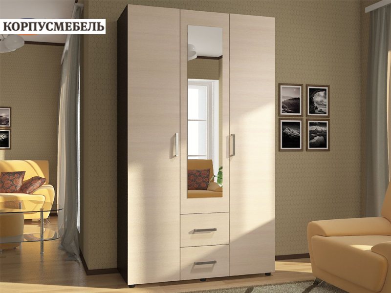 ЭВА Шкаф 3-х створчатый ШК-019 (Д.1178 х В.2062х Г.515 мм) состоит из корпуса и фасада. Корпус и фасад изготавливаются из ЛДСП 16мм и закромлены кромкой ПВХ толщиной 0,4 мм. На центральной створке наклеено зеркало с еврокромкой по периметру. Задняя стенка выполнена из ДВП простого толщиной 3,2мм. Полезная глубина шкафа 490 мм. Шкаф разделен на две зоны для хранения. Слева располагаются четыре полки для хранения белья. Справа размещена металлическая штанга для хранения верхней одежды. Над штангой расположена полка. Центральная створка без ручки, открывается после открытия основной правой створки. В самом центре шкафа под створкой с зеркалом имеются два выдвижных ящика на роликовых направляющих глубиной 400 мм. Высота боковины ящика 138 мм. Максимально допустимая равномерно распределенная нагрузка на ящики до 8 кг.