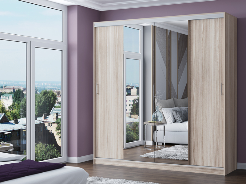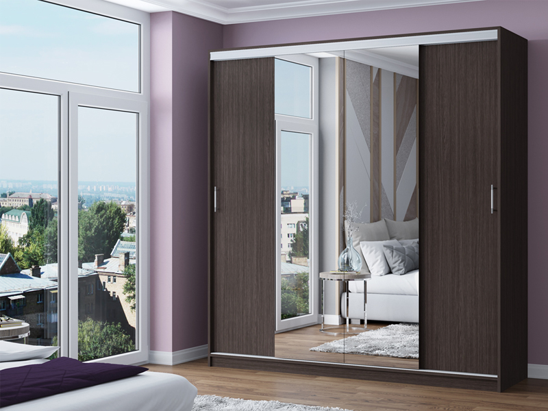 Шкаф-купе Альянс-3 является идеальным шкафом, не занимает много места и очень вместительный. Две из четырех раздвижных дверей у шкафа украшены зеркальными вставками от пола до карниза.