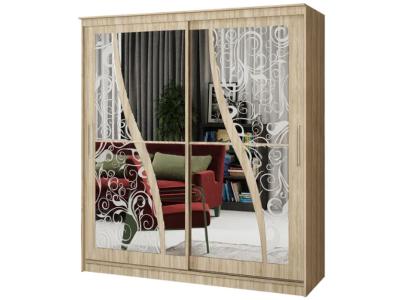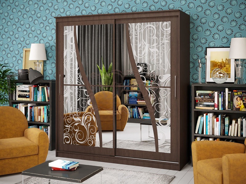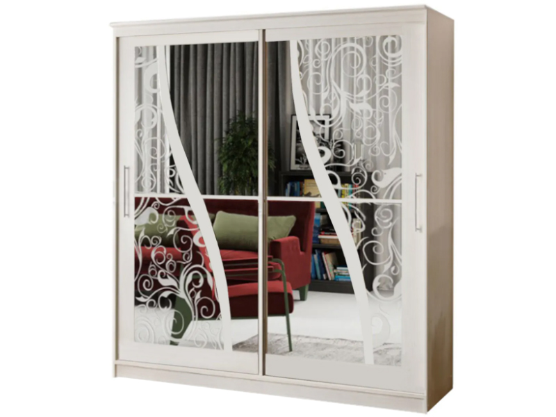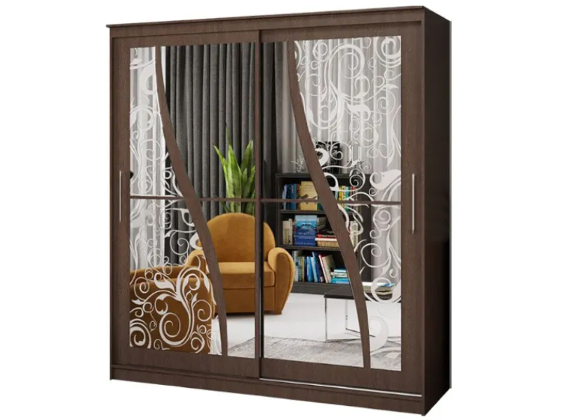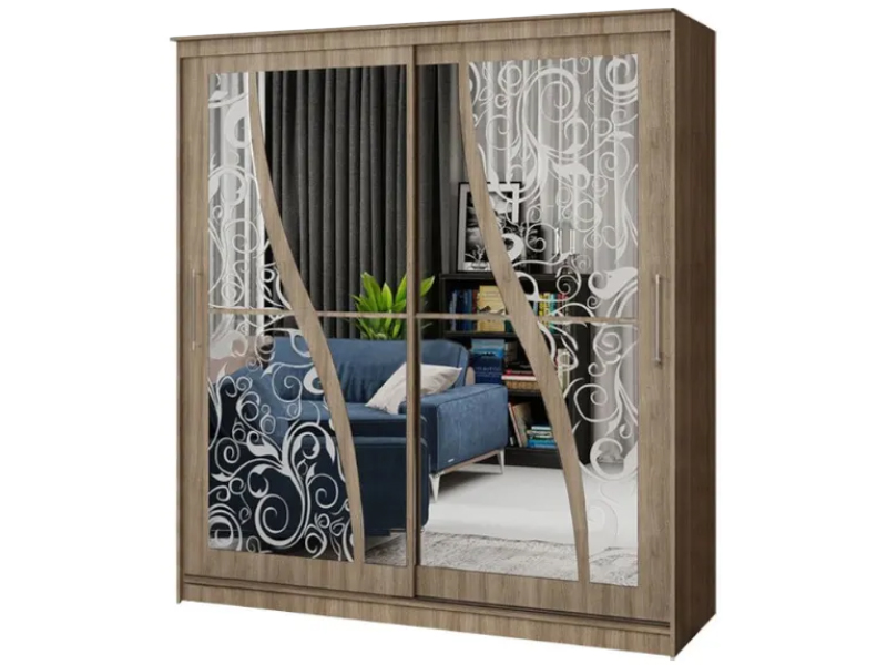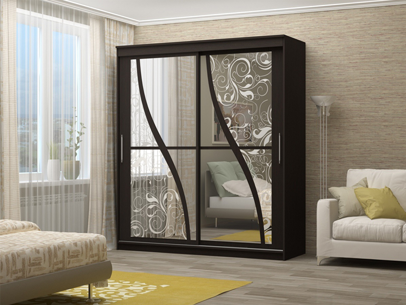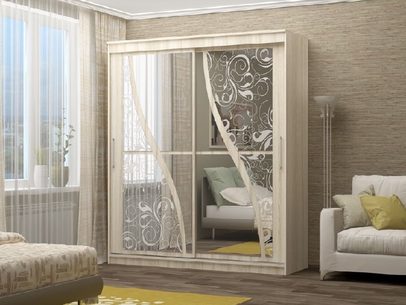 Достойное решение для современного интерьера. Обычный шкаф-купе за счет уникального дизайна приобретает новую эстетику. Большие зеркала декорированы пескоструйным рисунком.