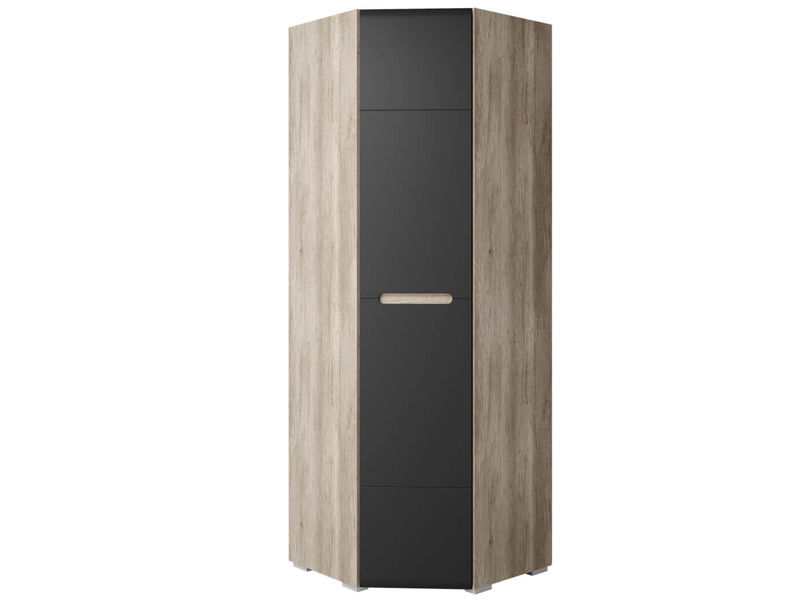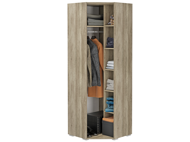 С умом использовать пространство поможет угловая модель шкафа "Наоми" из одноименной модульной серии. Изделие выполнено из ЛДСП, фасад распашной дверцы состоит из МДФ темного цвета и имеет встроенную ручку. Внутри шкаф разделен на две зоны для размещения одежды на вешалках и хранения сложенных вещей на полках.