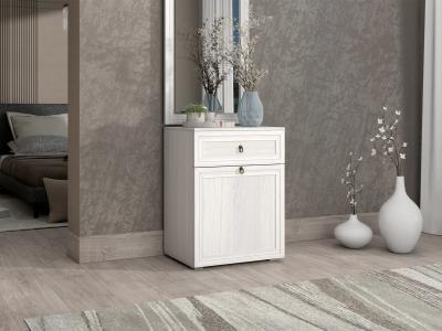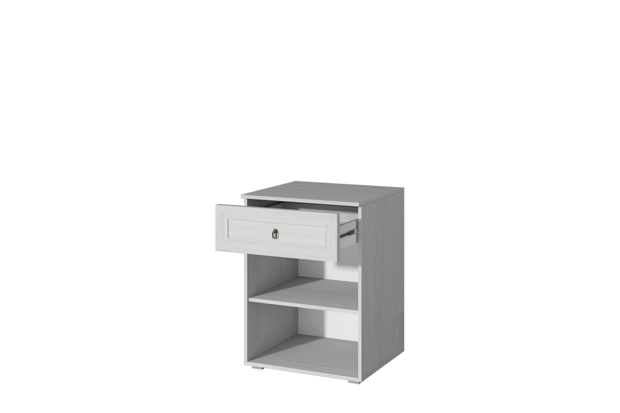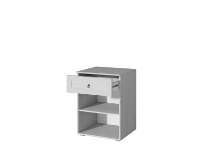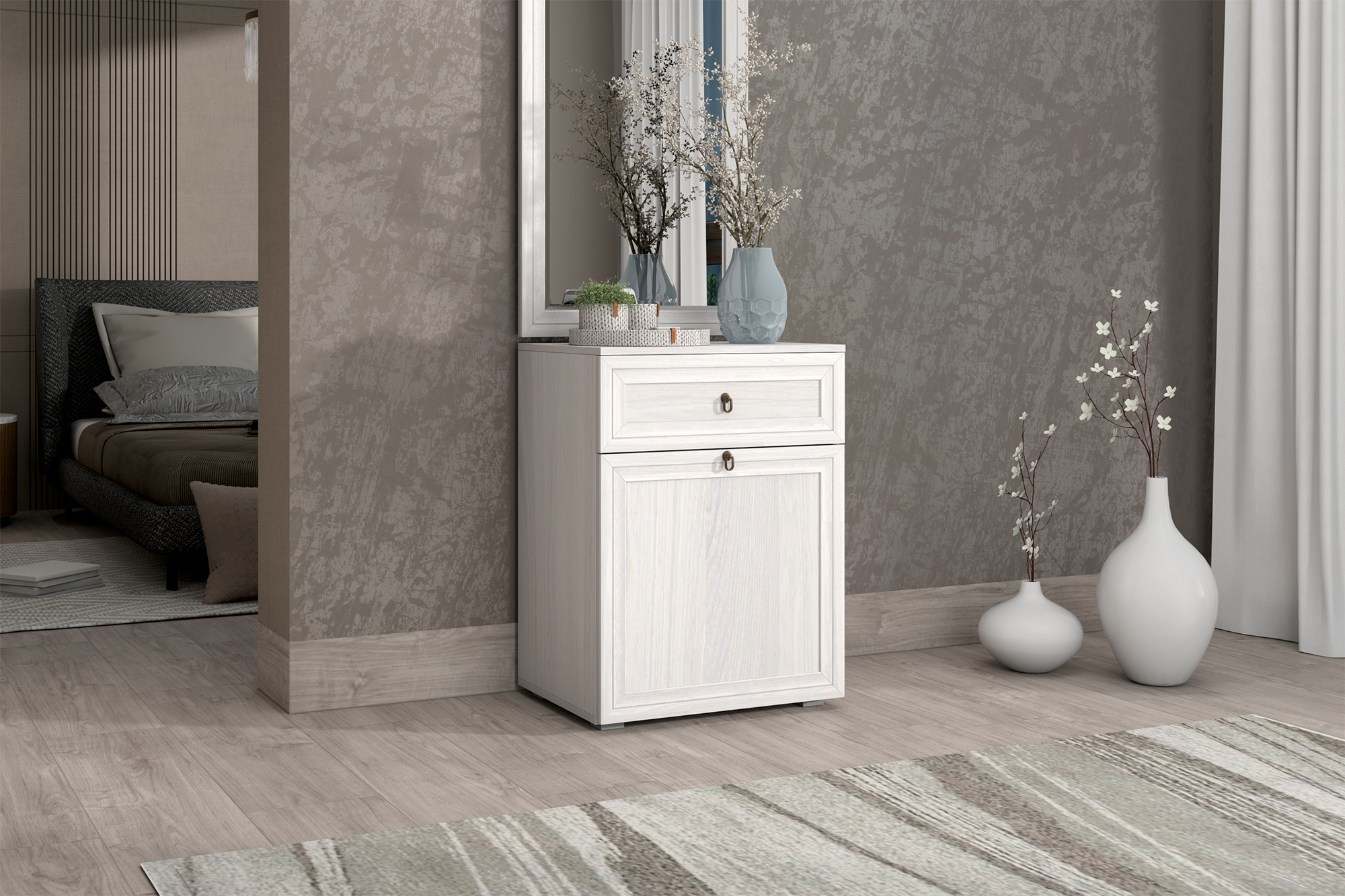 - Тумба включает в себя выдвижной ящик на шариковых направляющих и отделение для хранения с полкой.