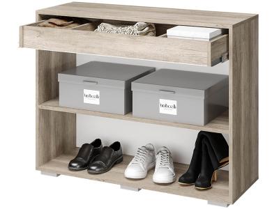 Неглубокая тумба "Наоми" может использоваться в любой комнате вашей квартиры или дома. Модель оснащена одним выдвижным ящиком и двумя распашными дверцами, за которыми находятся полки для хранения. Изделие имеет характерную для коллекции "Наоми" отделку: корпус выполнен из ЛДСП в цвете "дуб каньон", а темно-серые фасады имеют интегрированные ручки.