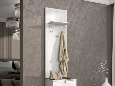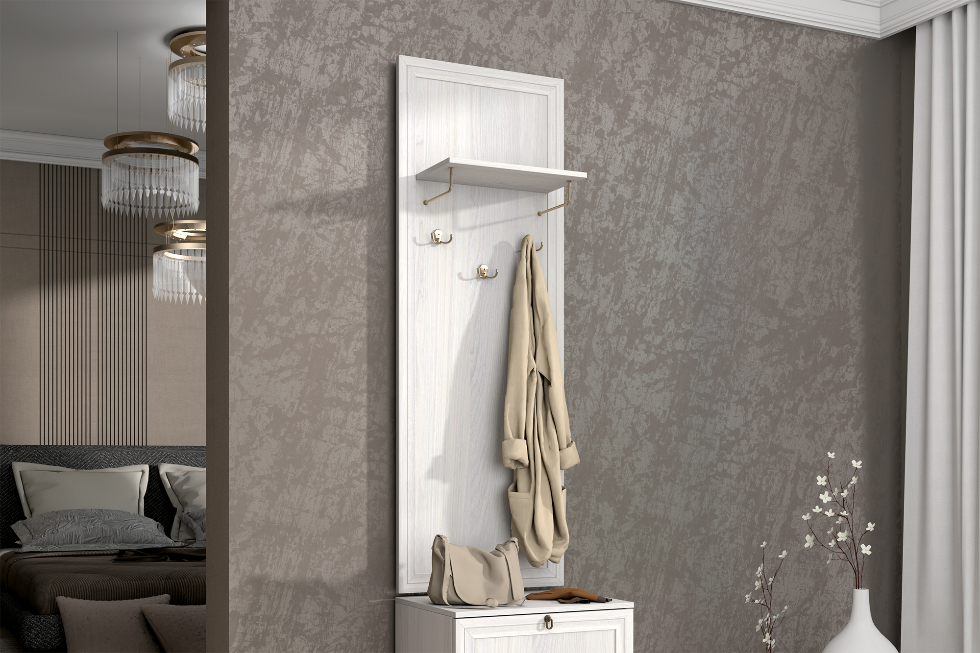 - Фурнитура в классическом золотом цвете: крючки под одежду и кронштейны для полки под головные уборы.