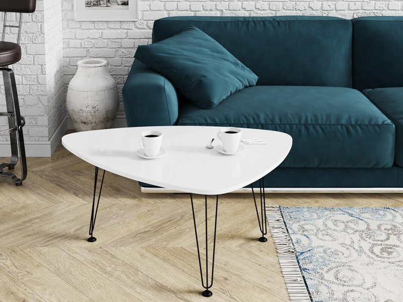 Стол журнальный №13 выполнен в едином художественном и конструкторско-технологическом решении, предназначен для оборудования гостиных жилых квартир. Стол журнальный №13 представляет собой МДФ столешницу неправильной треугольной формы с закруглёнными углами, облицованной плёнкой ПВХ на LOFT опорах чёрного цвета высотой